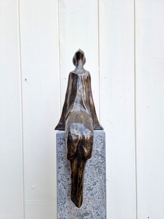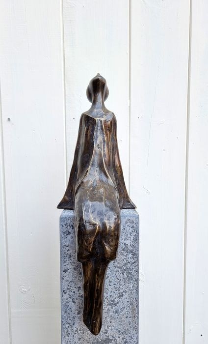 Zeer mooi modern en abstract sculptuur van een zittende vrouw die naar de sterren kijkt. Bronzen sculptuur ' De sterrenkijker'. De afmetingen van dit moderne kunstwerk zijn als volgt:
