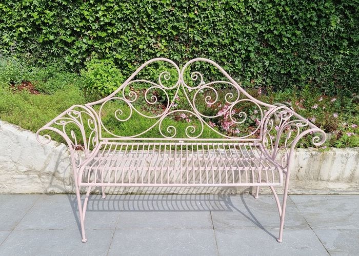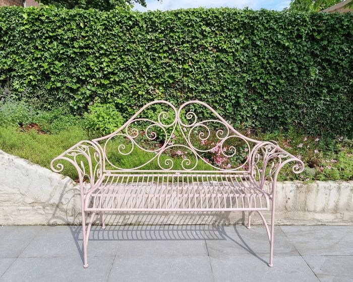 Het betreft hier een prachtige smeedijzeren bank. De bank is gemaakt van gesmeed ijzer en mooi afgewerkt in een sprookjesachtige roze patina. De afmetingen zijn als volgt (+/-):