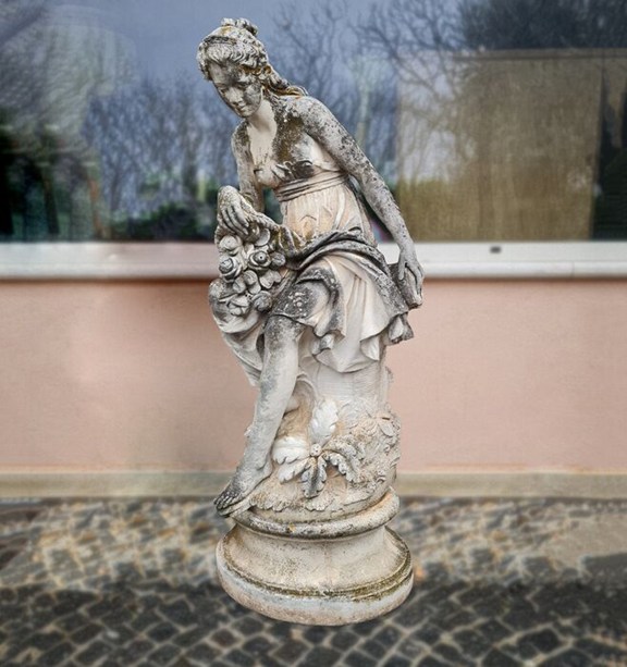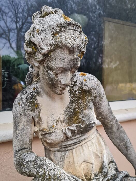 Gemaakt van Vicenza steen, in prachtige patina, afbeelding van een muze met bloemen.