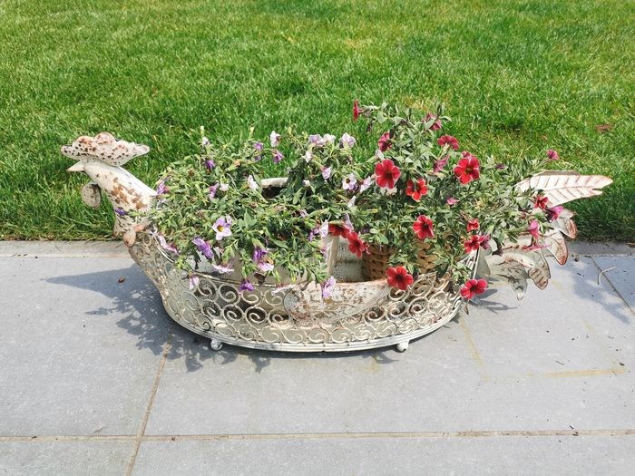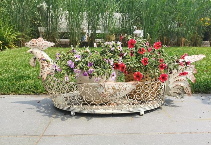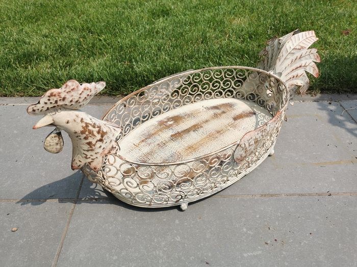 Dit is een prachtige smeedijzeren bloemenmand / plantenmand. Zeer mooi ontwerp in een grijze neutrale kleur. Ontworpen in de vorm van een haan. Zeer mooie met een hangplant erin. Mediterraanse decoratie. De afmetingen van dit sculptuur zijn als volgt: