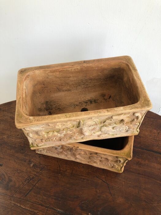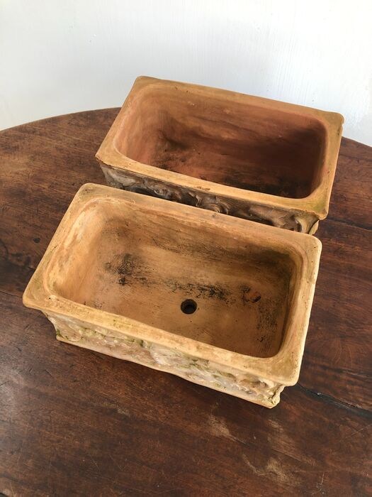 2 rechthoekige geornamenteerde plantenbakken van aardewerk