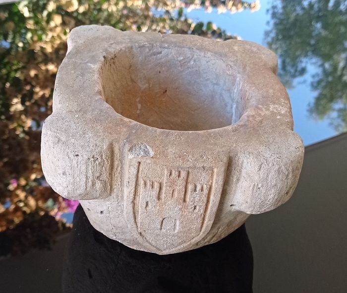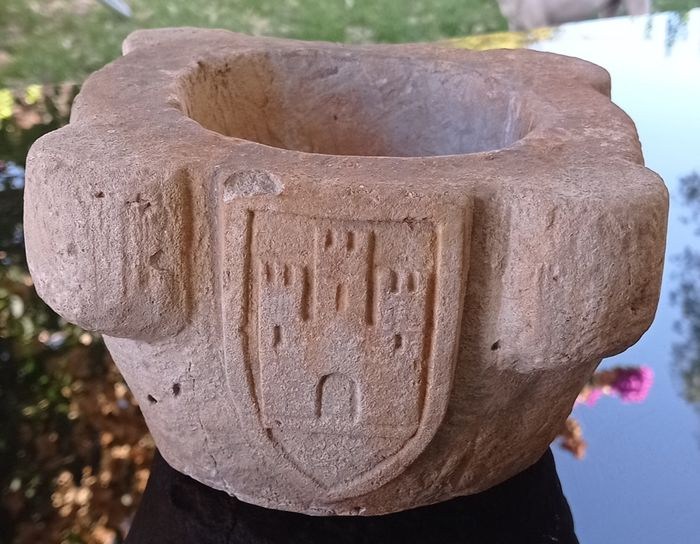 Mooie antieke vijzel in steen met gebeeldhouwd kasteel. Lichte onvolkomenheden. Voor een beter idee van de mortel, zie de afbeeldingen
