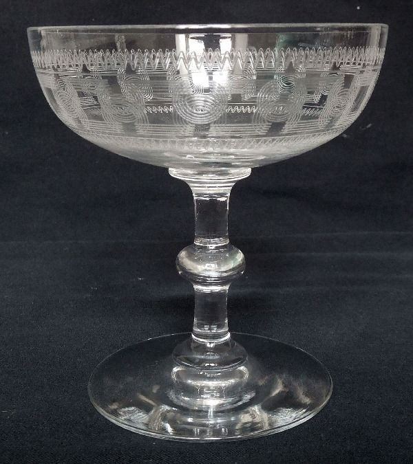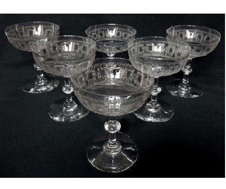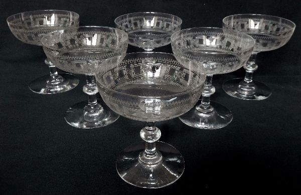 Een prachtige serie van 6 Baccarat kristallen champagneglazen, model met cilindrische vorm van kristal gegraveerd met griekse friezen, rechte steel met knop.