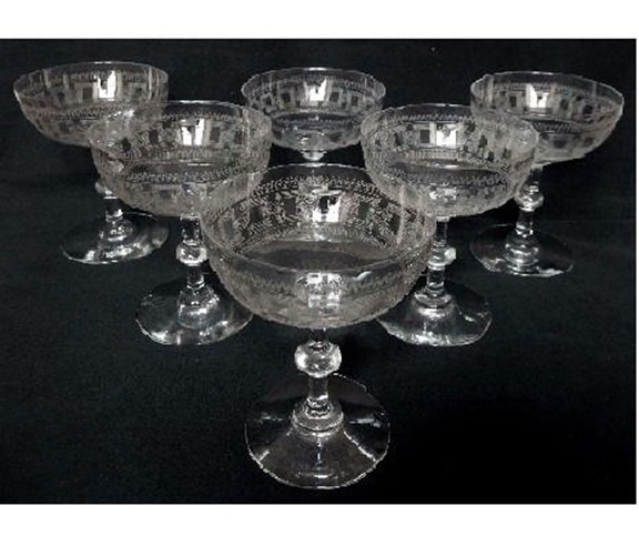 Deze champagneglazen zijn een productie uit het begin van de 20e eeuw, vóór 1936: ze zijn dus niet gesigneerd. Dit model staat vermeld in de catalogi van 1907 en 1916 (gravure 3458).