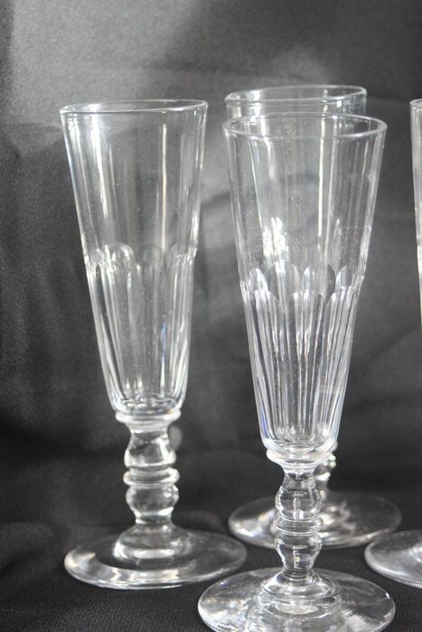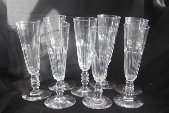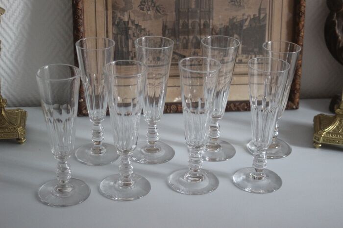 Serie van 8 fluiten in Baccarat kristal, model met dubbele balustervoet en facet geslepen platte zijkanten.