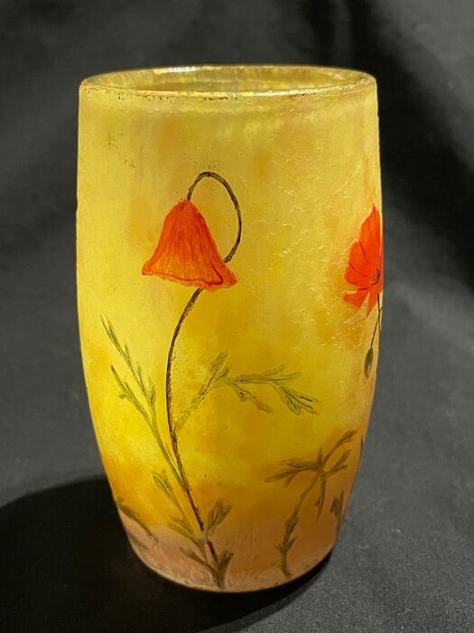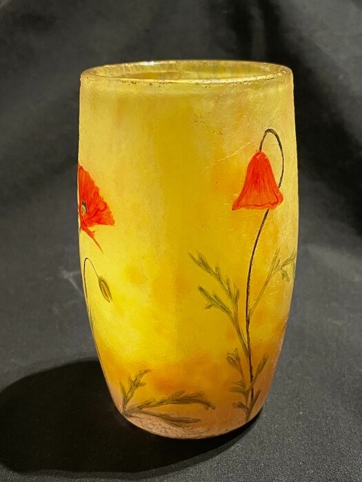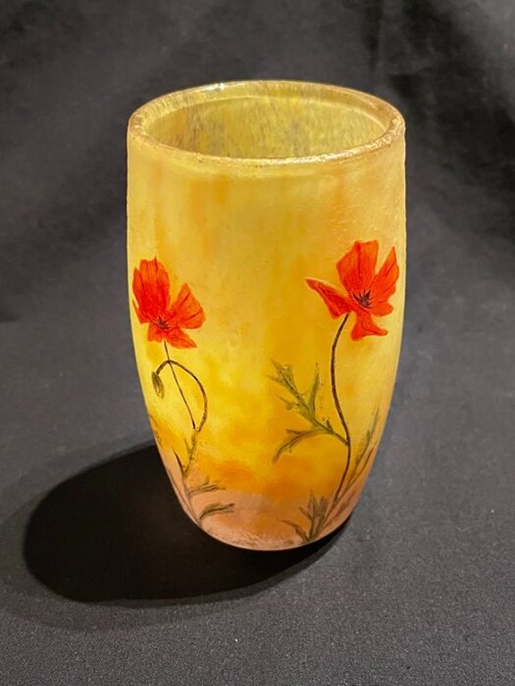In marmoreal glas gedecoreerd met met zuur geƫtste cameo-papavers, geƫmailleerd en verbeterd met goud.