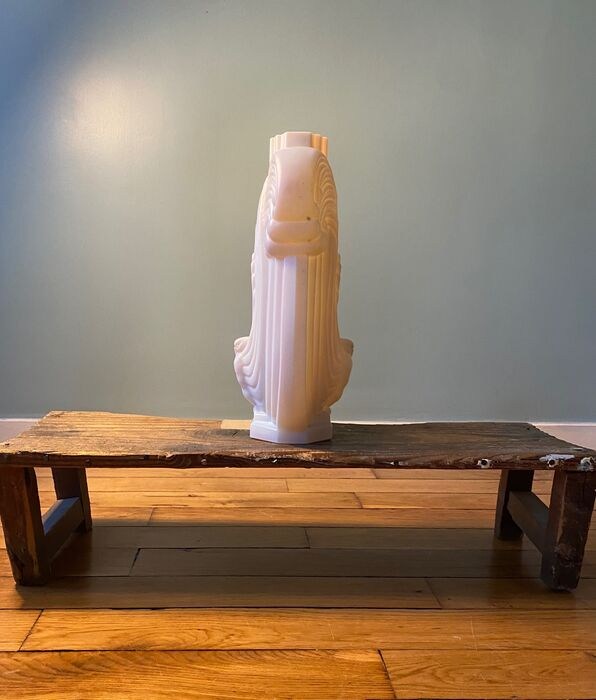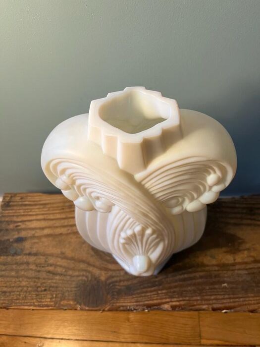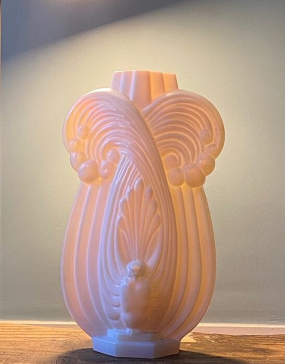 Art deco opaline vaas met een gestileerd pauwmotief van Etling, jaren 20.