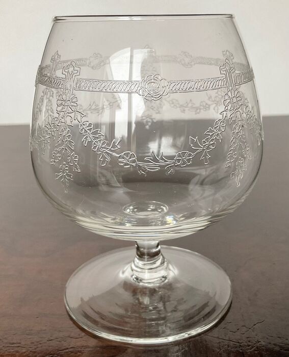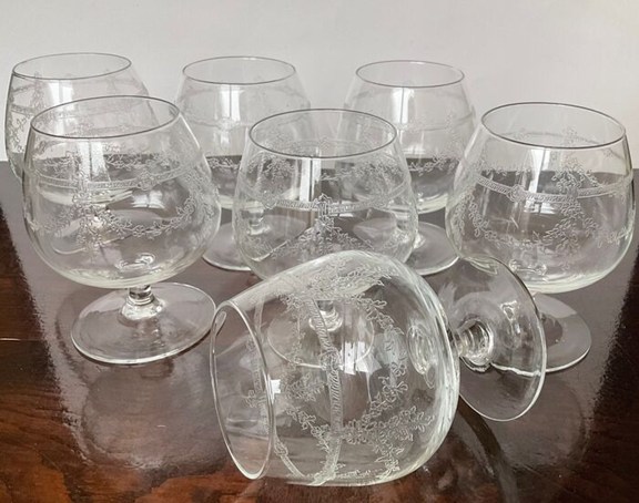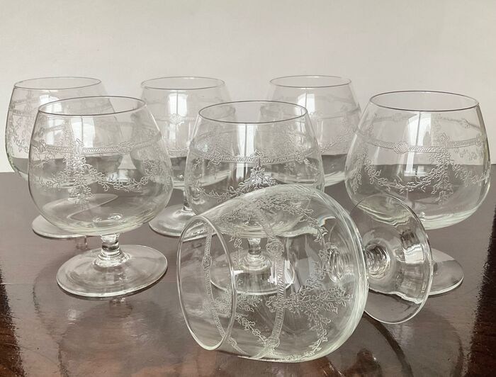 7 Nederlandse mondgeblazen glazen, gedecoreerd met barokke slingers en bloemen, voor het proeven van geweldige likeuren, Armagnac, Cognac, Calvados en andere kostbare dranken. De kleine gebreken die u kunt vinden, garanderen dat het product volledig handgemaakt is.