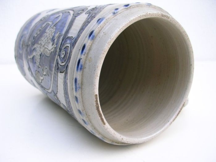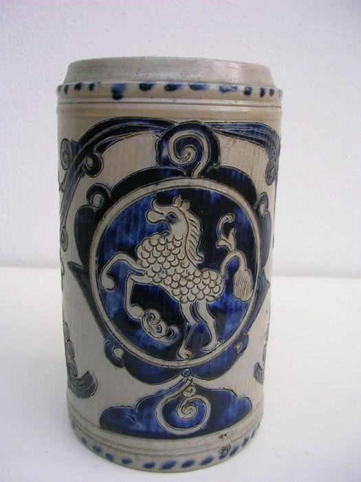 Mooie bierpul met ingekerfde decoratie van een steigerend paard. Met cobalt ingekleurd.