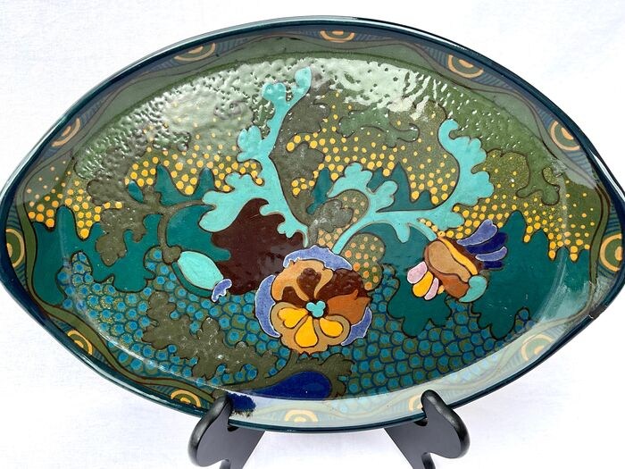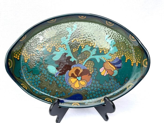 Dit mooie dienblad is gemaakt bij plateelbakkerij Arnhem. De afmetingen zijn 38 x 26 cm. Hij is gedecoreerd met een handgeschilderd decor Polo. De ontwerper van dit decor is Willem Hartgring die eerder bij plateelbakkerij Zuid Holland werkte. Dit decor Polo is de Arnhemse versie van decor Corona van plateelbakkerij Zuid Holland. Dit item is in een uitstekende maar heeft wel een bijgewerkt plekje op de bovenrand (laatste foto ) verder geen chips, scheuren of reparaties.