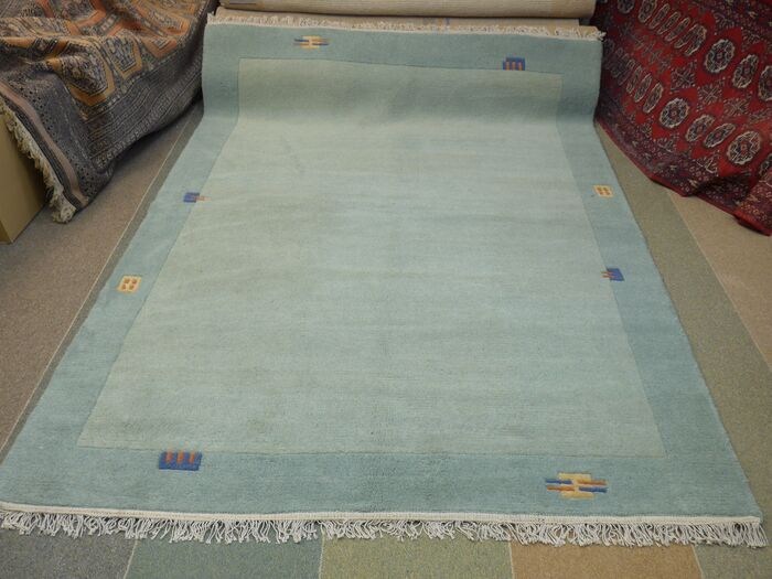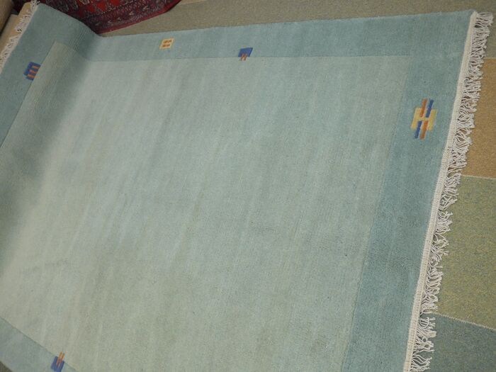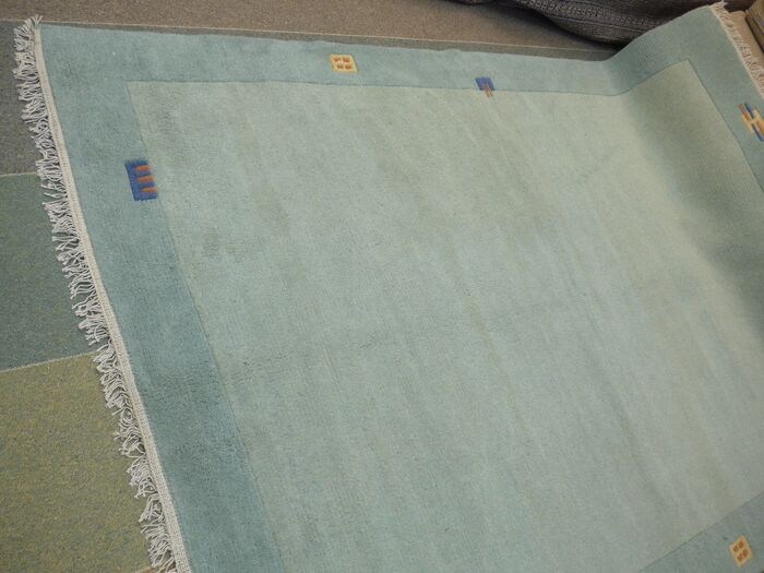 De kleur van lichtgroen op het pad en grijs, groen met beige in het midden van het tapijt hangt af van hoe de wol is gekamd