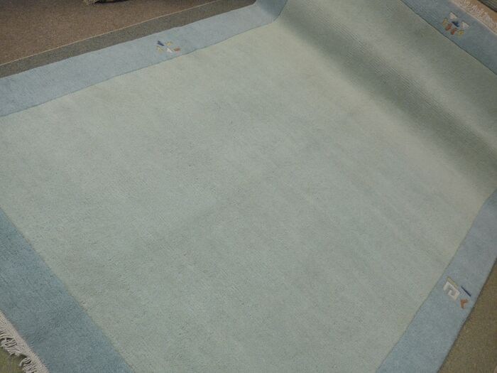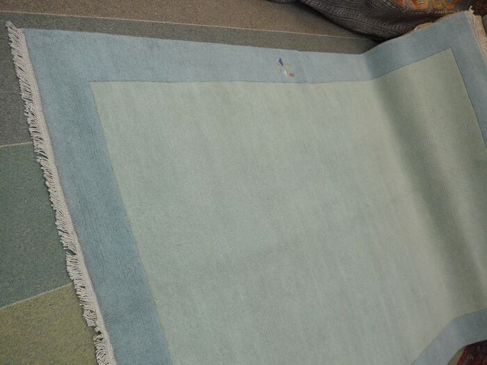 De kleur van lichtgroen op het pad en grijs, groen met beige in het midden van het tapijt hangt af van hoe de wol is gekamd