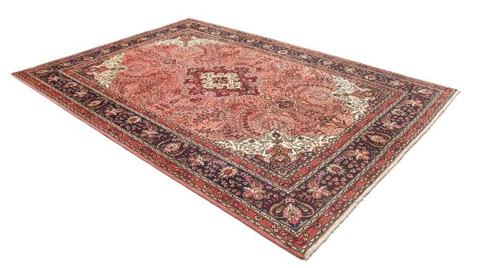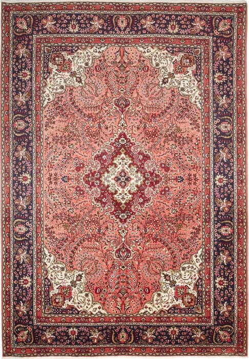 Deze tapijten worden geknoopt in werkplaatsen in de stad Tabriz in het noordwesten van Perziƫ. Een robuust, duurzaam tapijt met korte, grove pool. Het patroon bestaat uit een medaillon omgeven door arabesken, treurwilgen en cipressen.