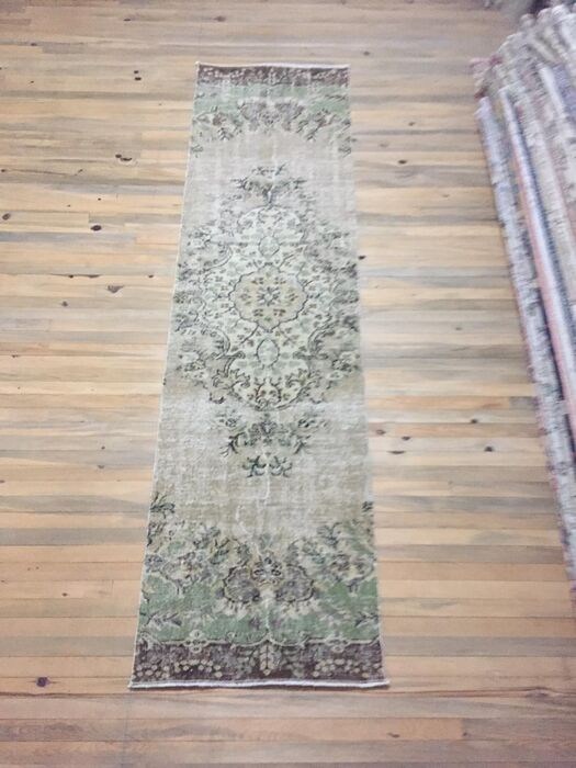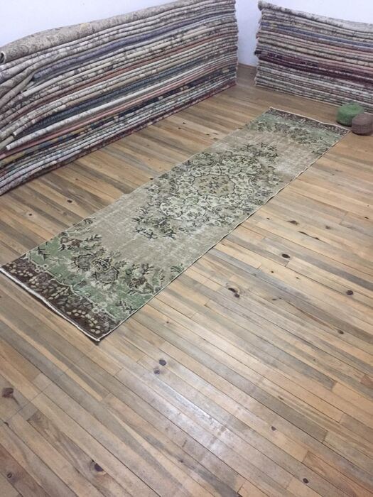 Dit vintage wol op katoen loper vloerkleed is handgemaakt geknoopt en geweven