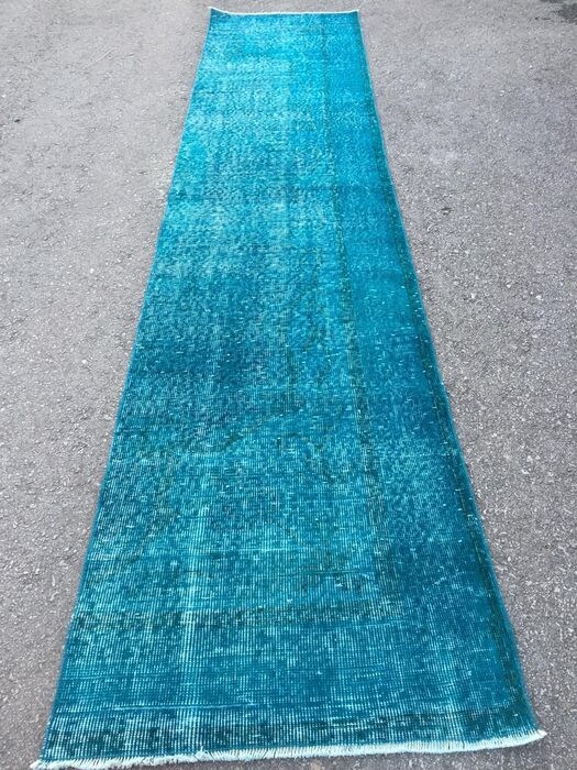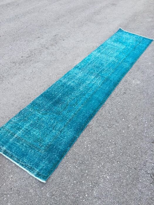 Dit vintage wol op katoen loper vloerkleed is handgemaakt geknoopt en geweven