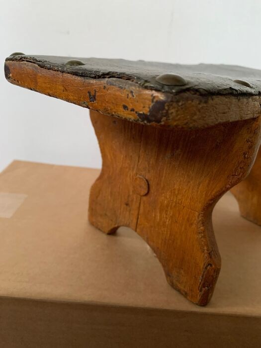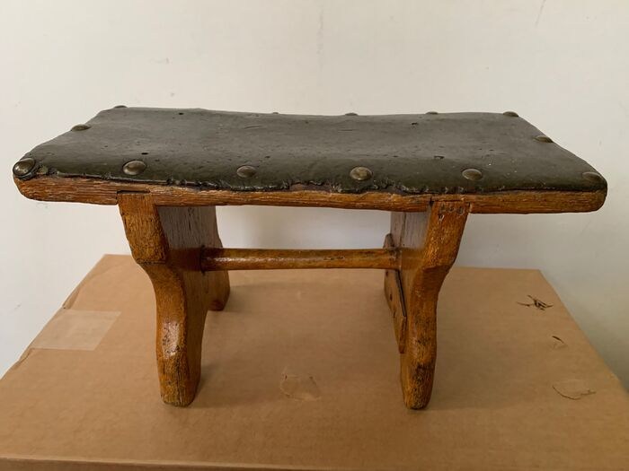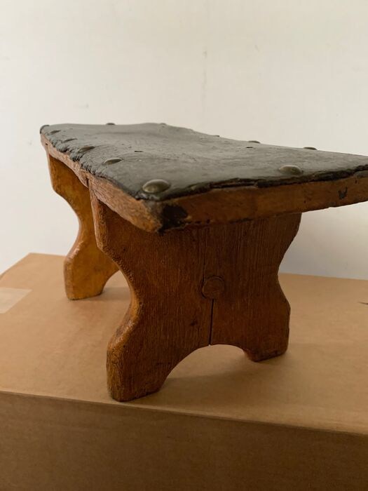 Antiek houten voetenbankje uit , naar schatting,begin 19e eeuw maar kan ook vroeger zijn. Oude gele beschildering en bovenzijde voorzien van een donkergroen dekje van leerachtig materiaal dat is vastgemaakt met koperen kopspijkers. Ronde houten stok om beide zijkanten steviger te maken. In een zijkant zit een oude barst dat met een klein plankje met spijkers is verstevigd. Op de hoeken is hier en daar de verf afgesleten. Oud zwart( vermoedelijk eiken ) hout is daar zichtbaar.