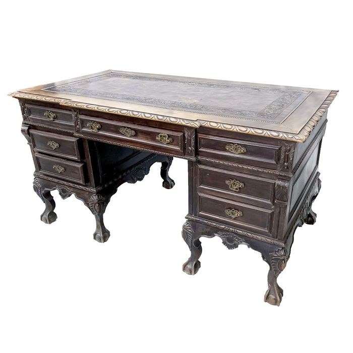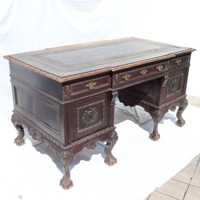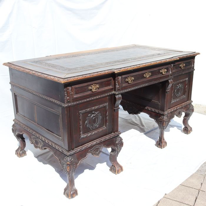 D. João V bureau in gebeeldhouwd massief hout. Met bovenkant bedekt met verhoogd leer. Met zeven lades. Afmetingen 80*152*86 cm.