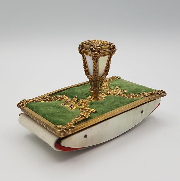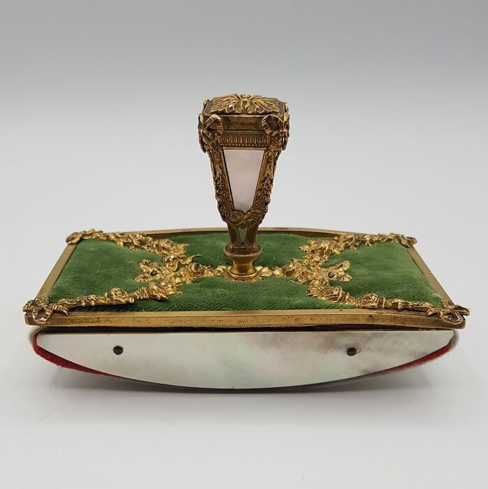 In het bovenste gedeelte, op een groene fluwelen achtergrond, heeft het blok een fijne beitel van het vergulde metaal dat rijk is aan friezen en de centrale knop is vakkundig versierd met parelmoer aan alle vier de zijden. Elegante parelmoer inzetstukken zijn ook terug te vinden op het schommelkussen.