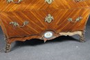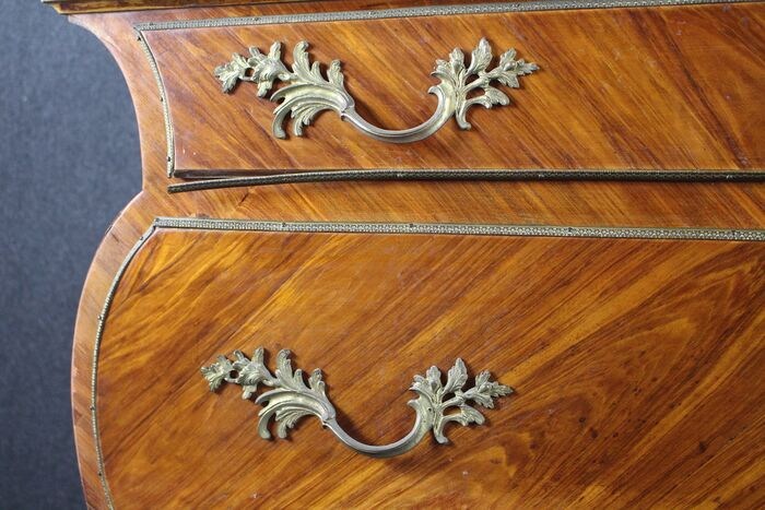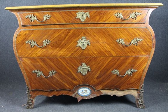 Mooie houten ladekast met drie lades en marmer in redelijke staat, heeft restauratiewerk aan het fineer nodig.