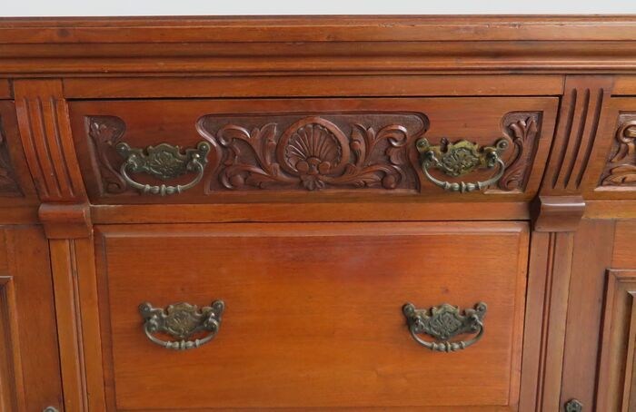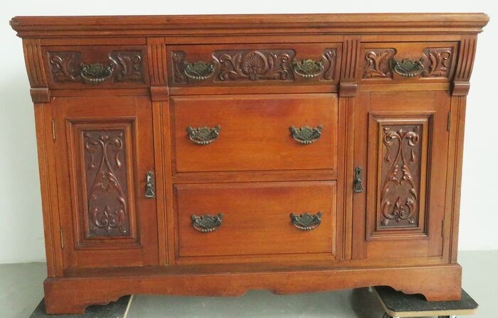 Dit dressoir heeft fraai floraal snijwerk aan de voorzijde.