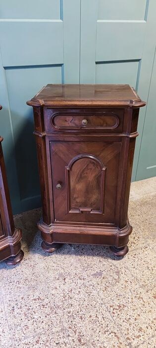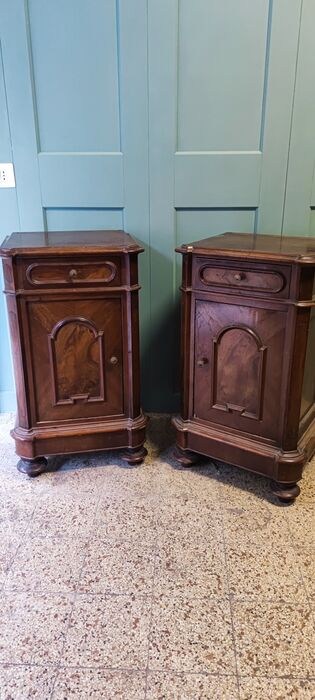 Te koop, een paar Italiaanse nachtkastjes uit het einde van de 19e eeuw in "Piedmontese" stijl in massief walnoot en gefineerd walnoot, lade en deur, volledig origineel, geen toevoegingen of aanpassingen, in goede staat met lichte ouderdomssporen, meet 45* 37, hoogte 80