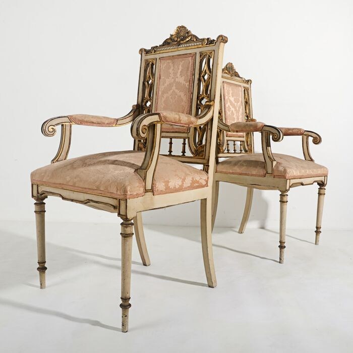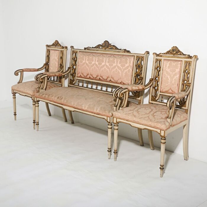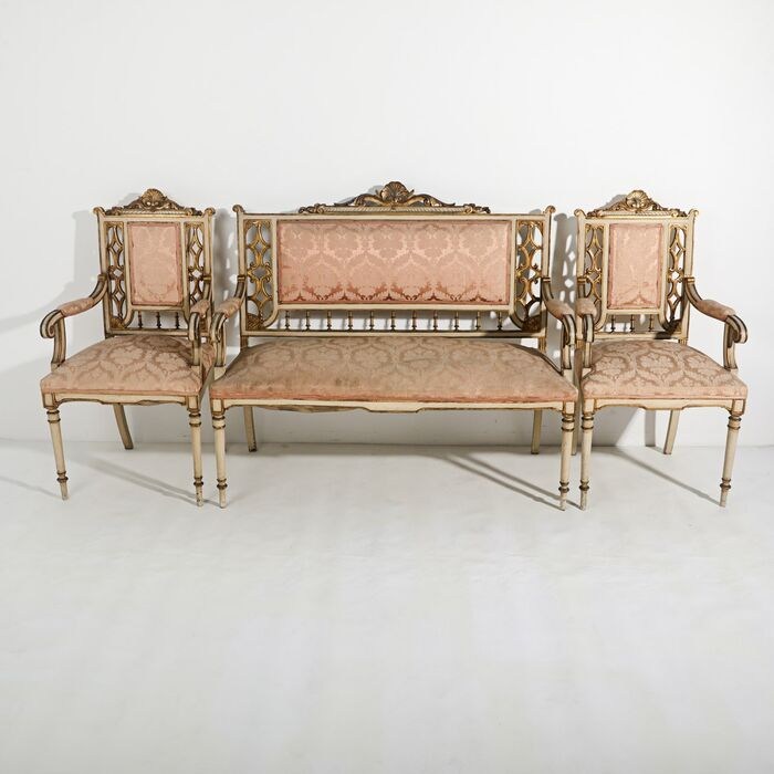 Canapé en fauteuils. Lodewijk XVI-stijl. Gesneden, polychroom en verguld hout