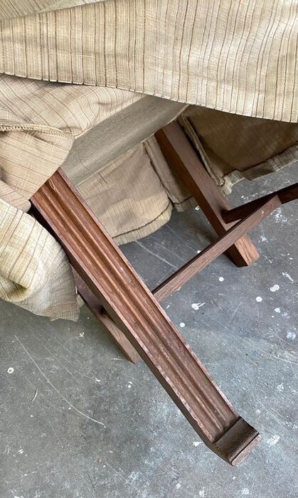 Afmetingen: 112 x 50 x 51 cm met hoge rug en afgeronde bovenfries, 4 sokkelsteunvoeten gegroefd op de schacht en verbonden met het onderstel. Nauwkeurige verpakking en intacte voering maar moet op meerdere plaatsen worden schoongemaakt.