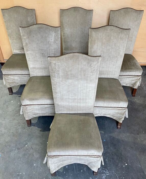 Zes grote massief houten stoelen volledig bekleed met fluweel uit de eerste helft van het midden van de 20e eeuw.