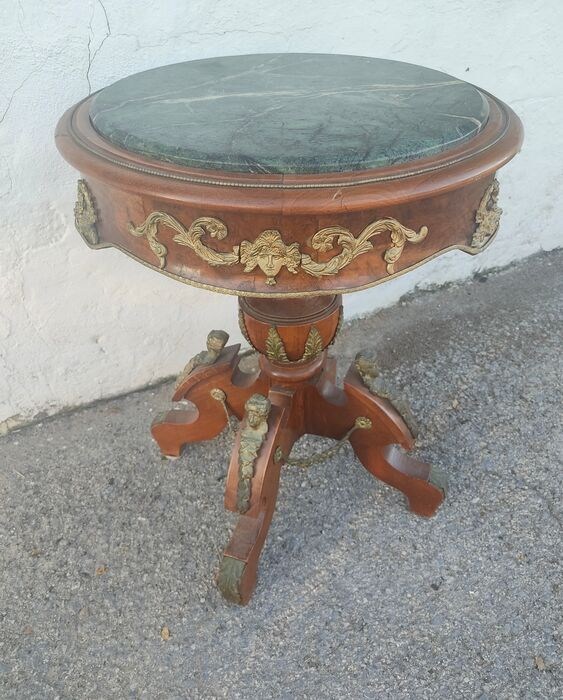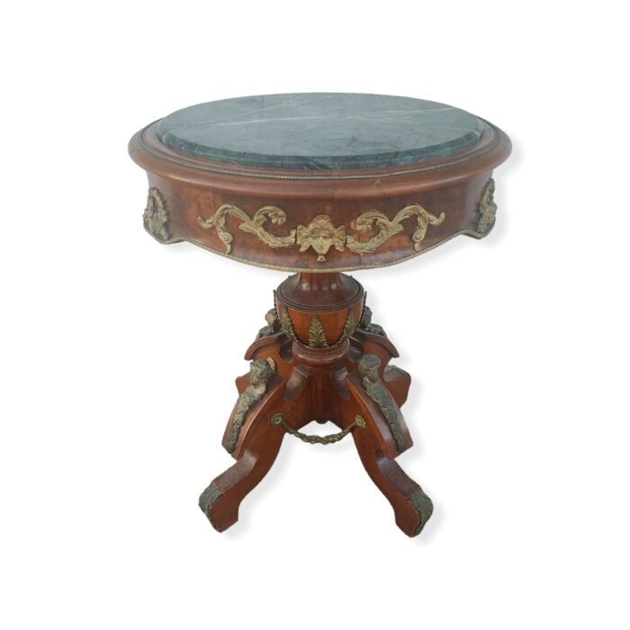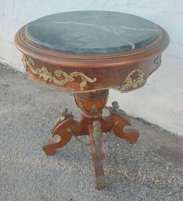 Met bronzen ornamenten met vrouwengezichten op de tafelriem en poten.