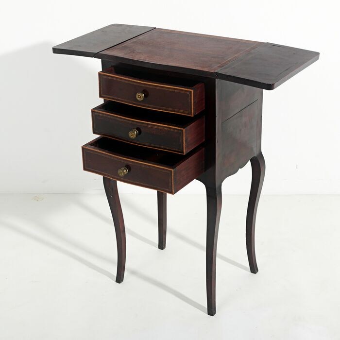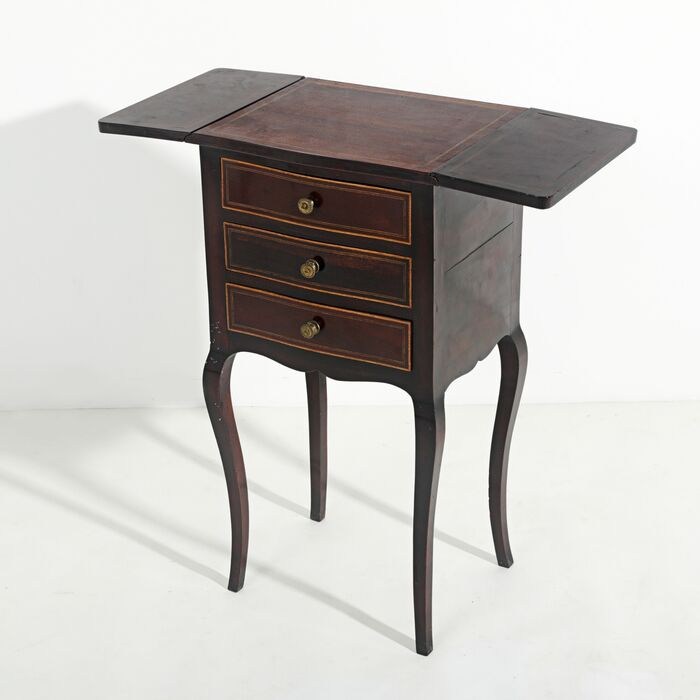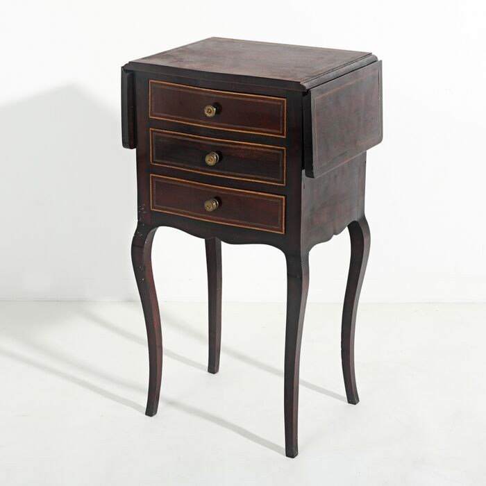Bijzettafel met kleppen, in mahoniehout en mahoniefineer, romp met drie laden, gebogen poten, vergulde metalen hardware. Portugees, 20e eeuw.