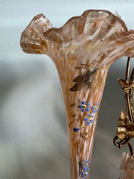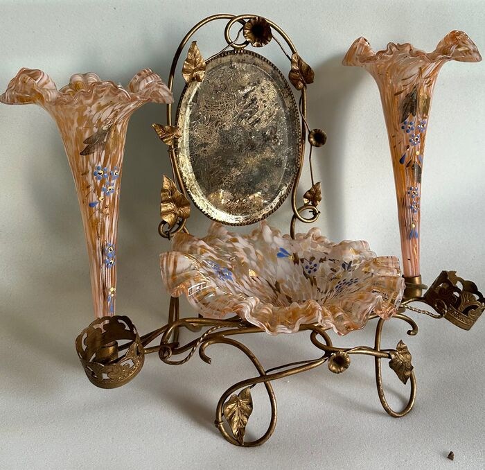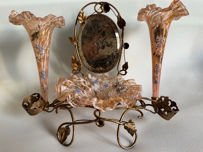 Indrukwekkende Napoleon III kaptafel in brons en met de hand gedecoreerd geblazen glas. Groot stuk. Prive collectie. Verzekerde verpakking. Klein microscopisch foutje in een van de violeteros.