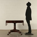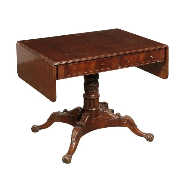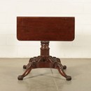 Vroege Vittoria-salontafel, ondersteund door een gedraaide en gebeeldhouwde centrale baluster, uitgerust met vier poten, ook gebeeldhouwd met bladranken. De bovenkant heeft twee zijvleugels die kunnen worden geopend en ondersteund door gekrulde uitgesneden planken, waardoor de bovenkant kan worden verlengd; in de onder-bovenband zitten twee lades. In gebrild mahonie, het interieur is in sparrenhout. Er zijn tekortkomingen.