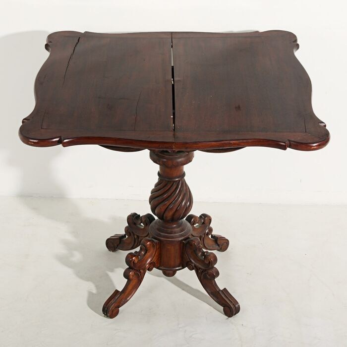 Romantische speeltafel. Mahonie hout. Golvende bovenkant, vouwbaar, glad en aan de uiteinden afgesneden. Midden gedecoreerd met plantmotieven en voluten. Kolom
