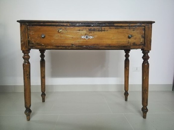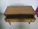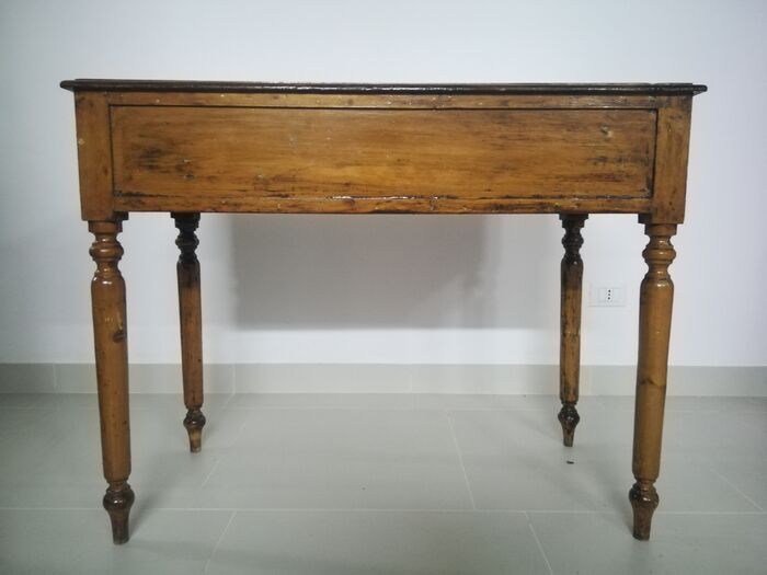 Licht notenhouten tafel met enkele ladekast, met messing knoppen, geplaatst in de 19e eeuw.