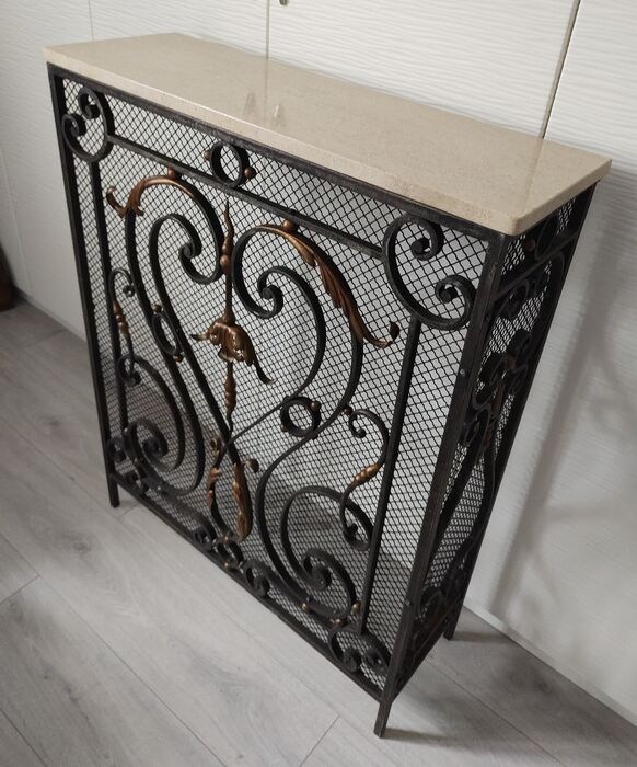 Sublieme console, oude radiatorbekleding in smeedijzer en marmer uit de jaren '20.