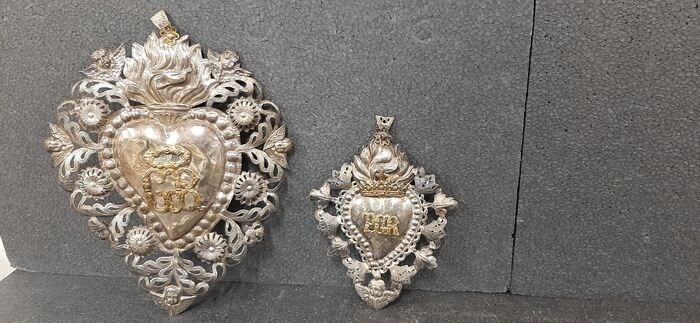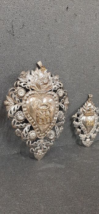 2 Grace Receipt in metaal uit de eerste helft van de 20e eeuw. Een daarvan is groot en ongewoon van formaat met 2 engeltjeskopjes, de andere ook met een engeltjeskopje op de onderste punt. Ze hebben de initialen "G.R." goud, ik zie geen keurmerken, maar heilige voorwerpen zijn vaak gemaakt zonder keurmerken en ik sluit niet uit dat ze van zilver zijn. Ze meten 26x20 en 18x12 cm.
