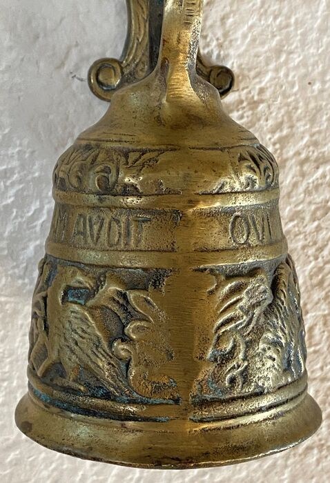 Antieke Bronzen Kloosterbel met Aartsengel en Heilige Symbolen. Bronzen.