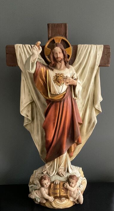 Prachtig Jezus Christus beeld uniek stuk gesigneerd door GH Parentani Fres Brussel België aan zijn voeten zie je twee prachtige engelen. Polychrome kleuren.