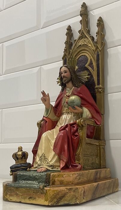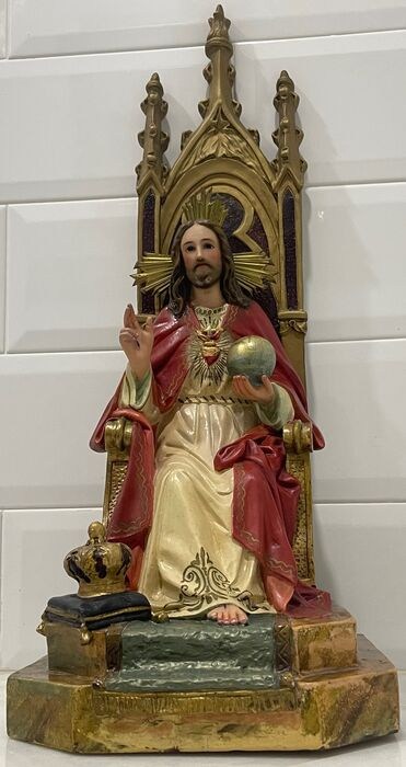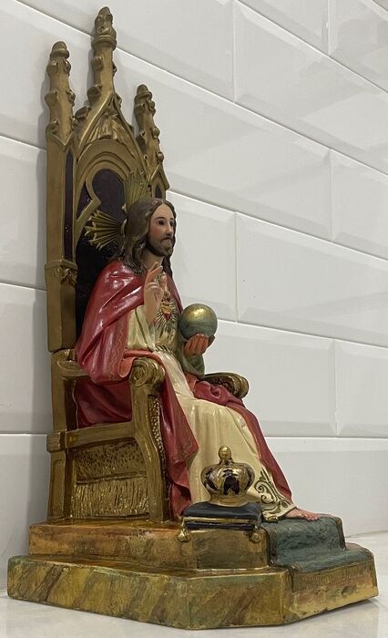 Oude en spectaculaire religieuze figuur die het Heilig Hart van Jezus op de troon voorstelt, van Spaanse oorsprong uit het begin van de 20e eeuw, met de hand gemaakt in polychroom stucwerk met een halo in gebeeldhouwd koper, glazen ogen op een neogotische troon op een houten voetstuk door een beroemd kunstenaar van het prestigieuze huis van OLOT. In uitstekende staat voor zijn leeftijd. Een waar collectors item.
