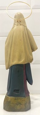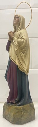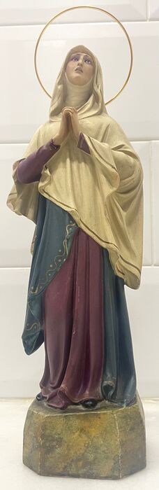 Oude religieuze figuur van de Maagd van Smarten verzegeld uit het beroemde huis van Olot door de beroemde kunstenaar PEDRO LLORET gemaakt aan het begin van de 20e eeuw in houtpulp op een houten voetstuk, koperen halo. Kristallen ogen. Een uniek stuk dat moeilijk te vinden is omdat het geen massaproductie is. Een waar juweel met de hand gemaakt en gepolychromeerd.
