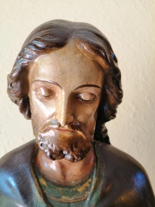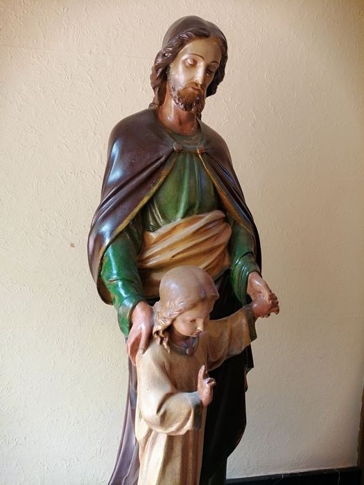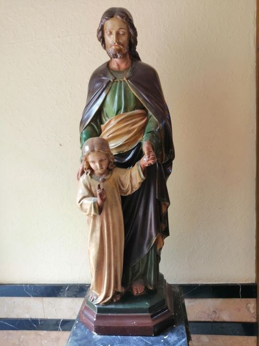 Prachtig Groot Antiek Handgeschilderd Heilig Kerkbeeld van Jozef met Kindje Jezus