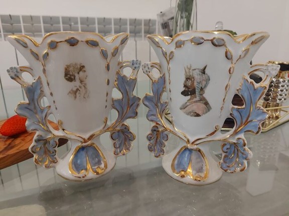 Het is een paar vintage trouwpotten, zoals je op de foto's kunt zien, er zijn tekenen van lichte nuances, maar het is erg mooi in porselein.