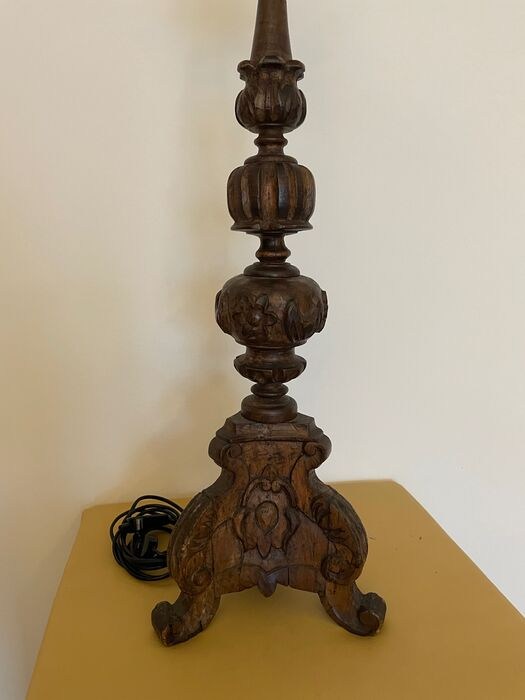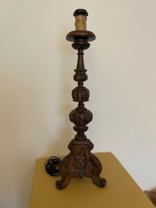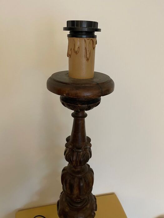 Mooie originele houten kandelaar uit 1800 in goede algemene staat en is al omgebouwd voor gebruik als bureaulamp, dus volledig functioneel