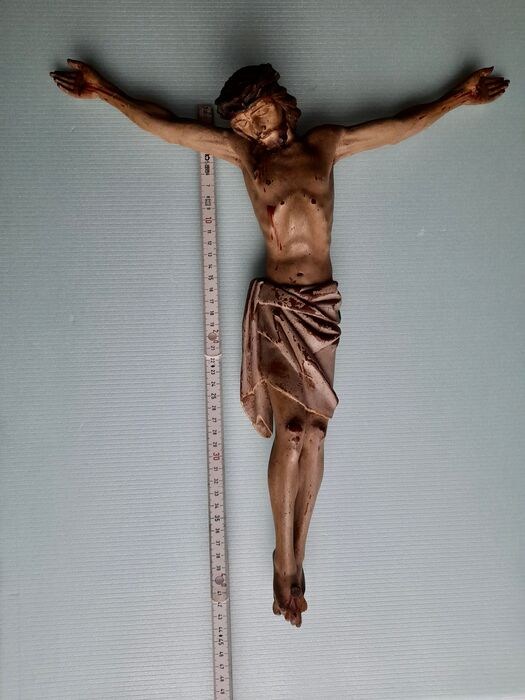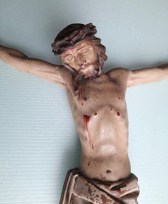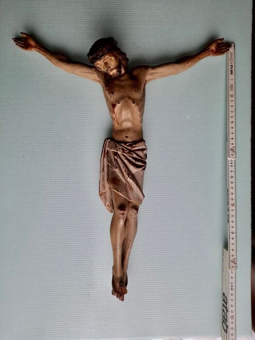 Mooie hangend, volledige, Christusbeeld, in licht hout, overtrokken met gips en beschilderd .