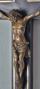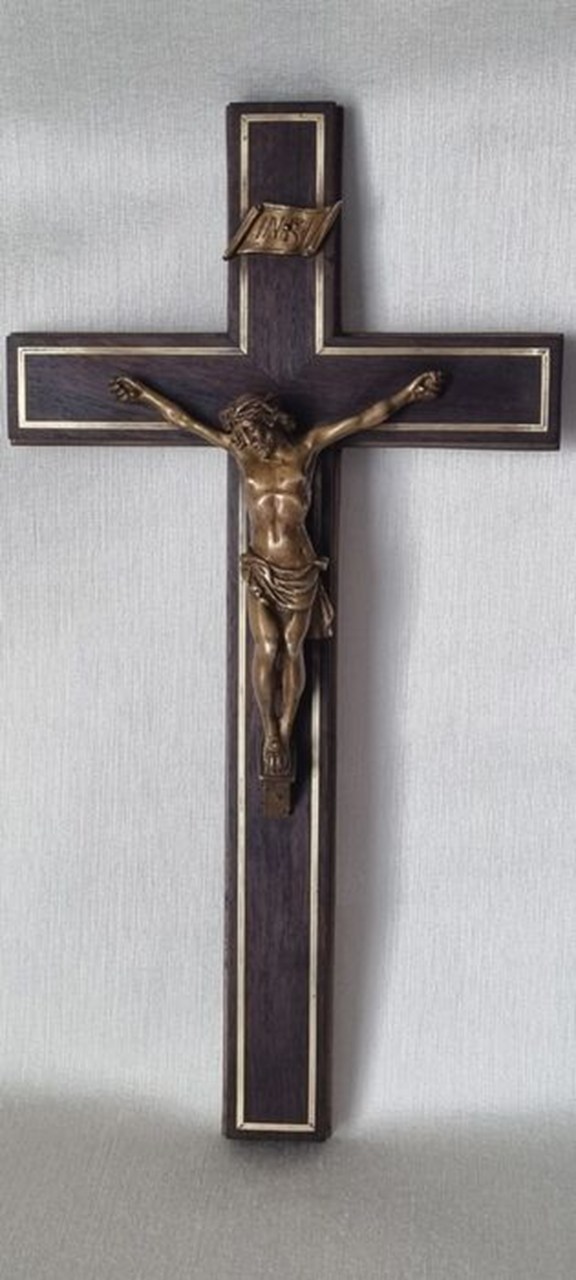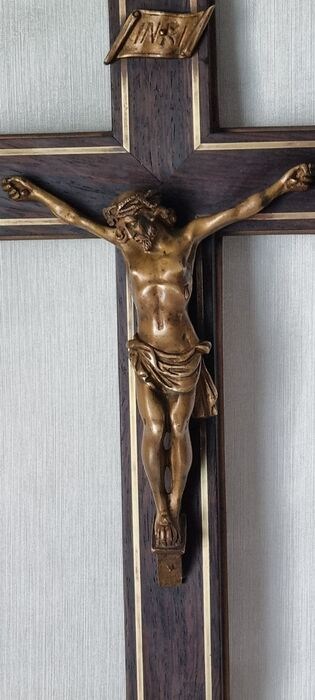 Prachtig bronzen kruisbeeld op palissander kruis met messing filet inleg. Het lichaam van Christus wordt afgebeeld met het perizonium aan de linkerkant vastgebonden. Mooi bronzen snijwerk.