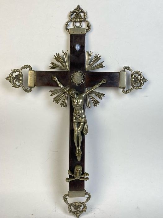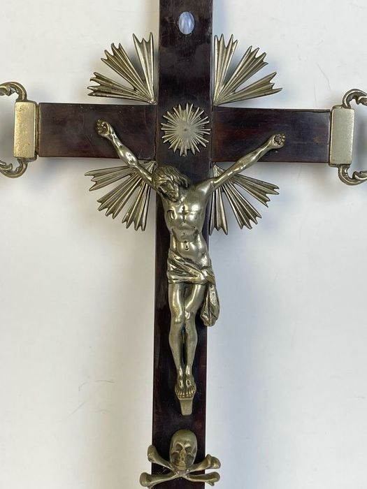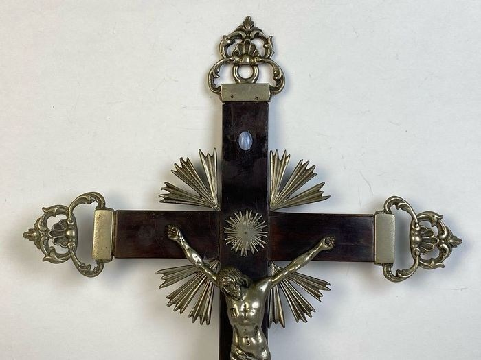 Kostbaar kruisbeeld van verzilverd metaal op een ebbenhouten kruis met verzilverde metalen punten en stralen als Christus.