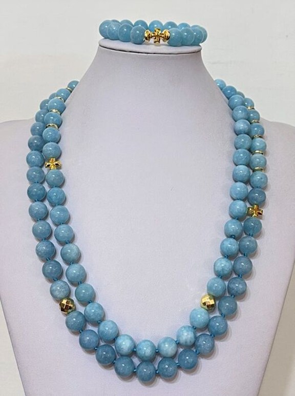 1) Exclusief collier, van Aquamarijn met Griekse kruisen van Hematiet (bescherming en evenwicht). Sterling Zilver 925.