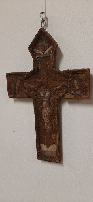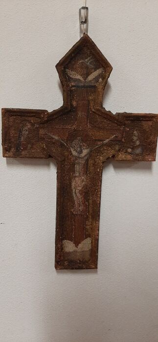 Kruis geschilderd in olieverf of tempera op hout in de eerste helft van de 18e eeuw of misschien zelfs ouder. Het stelt de gekruisigde Christus voor met twee heiligen aan de zijkanten en een witte duif in het bovenste gedeelte, allemaal binnen een gouden achtergrond. Dit kruis moet op een zeer vochtige plaats zijn opgeslagen, dus het moet zorgvuldig worden gerestaureerd. De aanwezige barst is prachtig evenals de patina en de compacte afmetingen van 40x26 cm. Vanwege de huidige regelgeving kan het niet buiten de Europese Unie worden verzonden.