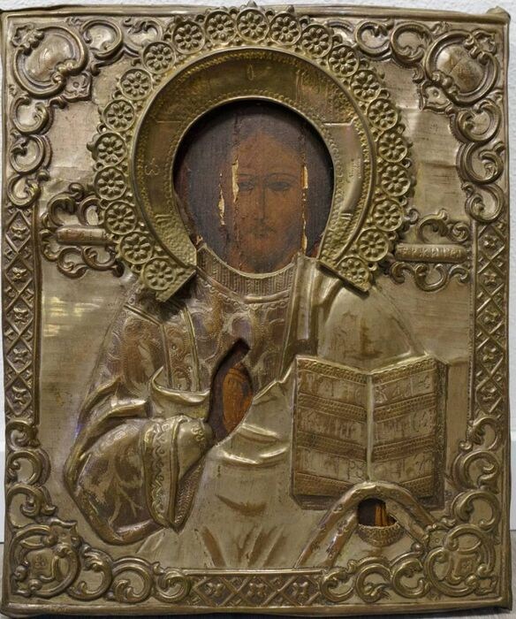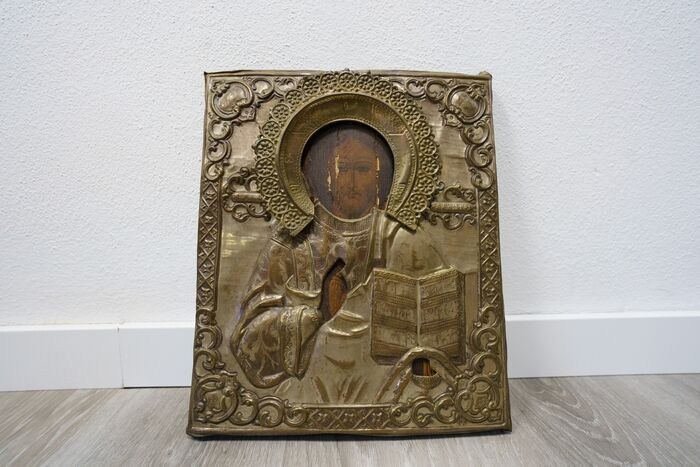 Icoon van Jesus Blessing Orthodoxe cirkel (Oost-Europa) 1800, in verguld met reliƫf.