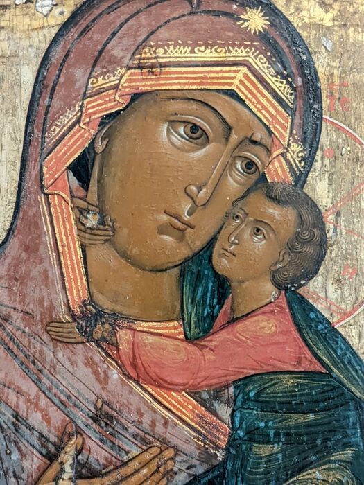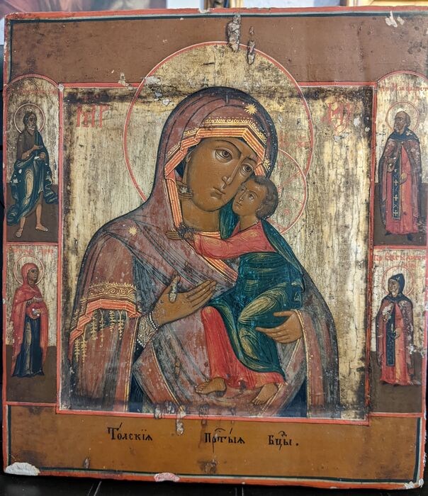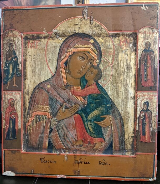Icoon van Onze-Lieve-Vrouw van Tederheid van de 19e eeuw. Vier randheiligen. Rusland, 19e eeuw Tempera op houten paneel. met Kovtsjeg. Sponki aan de achterkant.